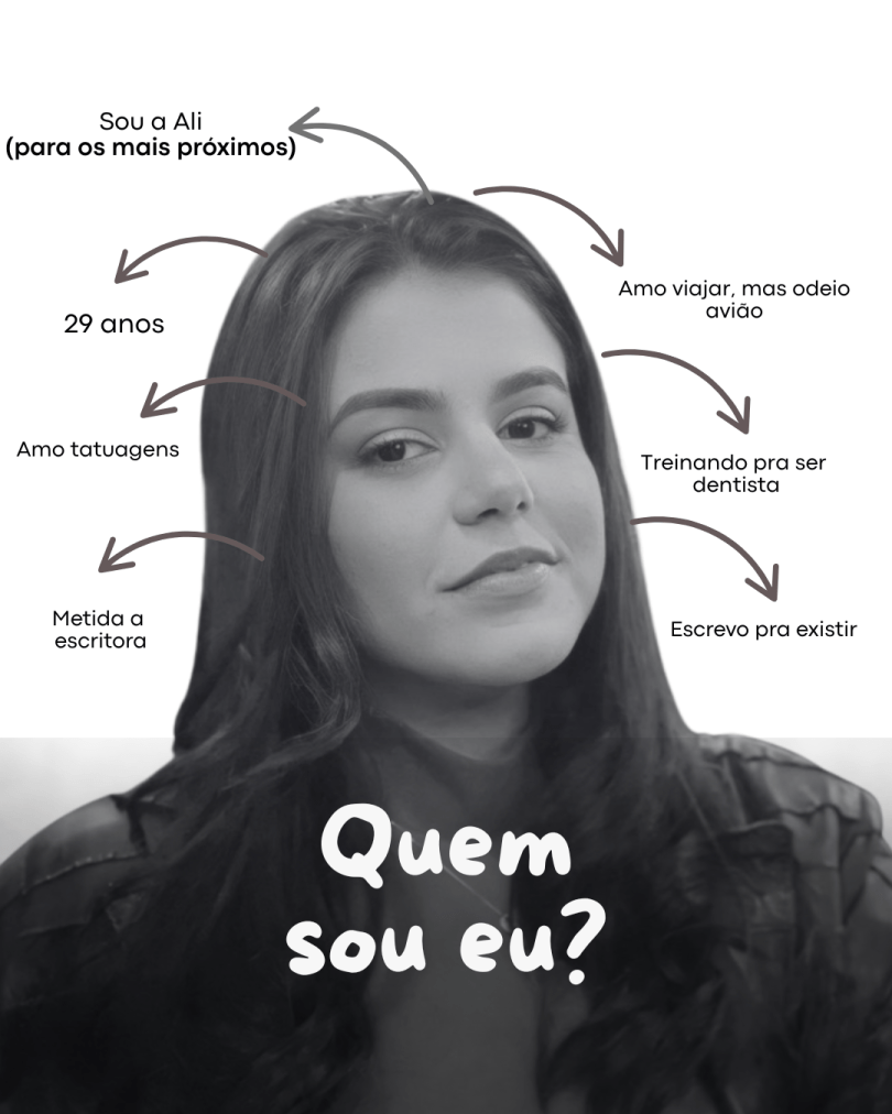 Sou publicitária, trabalhei como copywriter por quase 8 anos, mas antes disso já vivia cercada de palavras. Além de escrever, também gosto de desenhar (Só não sei). Hoje estudo odontologia. Foi um sonho que ficou guardado por anos, enquanto a vida me levava por outros caminhos. Me tornei mãe aos 21 anos e e a publicidade cruzou meu caminho como alternativa e acabou me ensinando muito sobre disciplina, escrita, criatividade e conexão. Mas o sonho de criança em ser dentista sempre ficou ali, aceso. A vida me levou a conciliar duas paixões: a ciência que cuida e a escrita que acolhe.